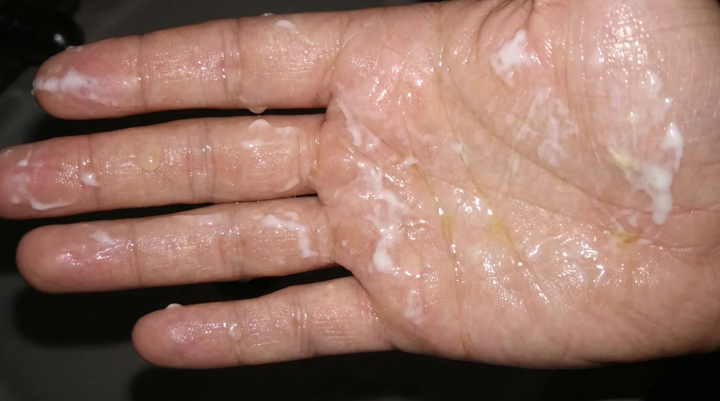 - Inizia la frizione palmare contando mentalmente fino a tre, assicurandoti che la texture diventi trasparente tra le mani.