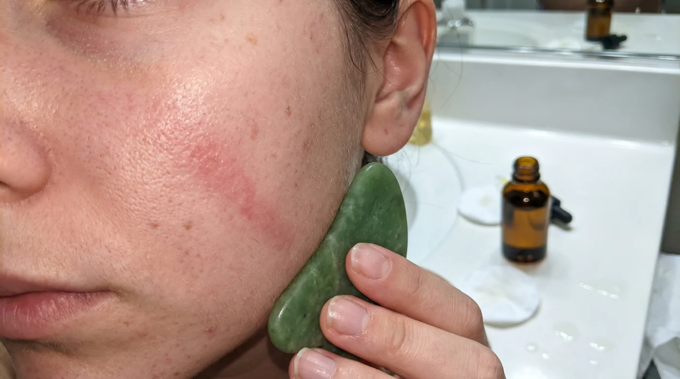 La luce fredda del mattino colpisce lo specchio del bagno, mentre tieni tra le mani quel pezzo di quarzo rosa o di giada. Senti il peso rassicurante della pietra a circa 20 gradi di temperatura ambiente, la sua superficie perfettamente liscia, e inizi a farla scorrere lungo la mascella, sperando di cancellare i segni del sonno. Ma c’è un dettaglio silenzioso che trasforma questo antico gesto di cura in un impercettibile sabotaggio quotidiano.